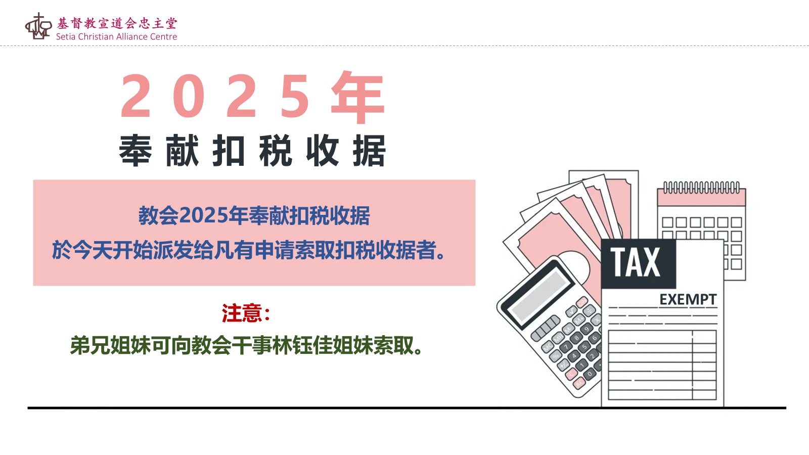 - 2025年奉献扣税收据:教会已经备妥2025年奉献扣税收据,并於今天开始派发给凡有申请索取扣税收据者。请弟兄姐妹留意,扣税收据只包含可扣税的奉献项目,任何查询可联络教会干事林钰佳姐妹。