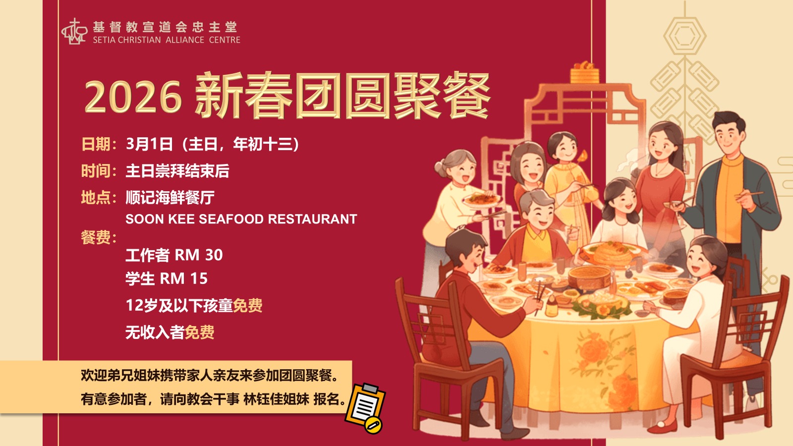 - 新春团圆聚餐:本堂将於下主日,3月1日的崇拜结束后,在“顺记海鲜餐厅”举行“2026年新春团圆聚餐”。诚心欢迎弟兄姐妹携同家人亲友同来参加当天的聚餐。凡要参与者,请向教会干事林钰佳姐妹报名,餐费为工作者RM 30,学生RM 15,12岁和以下年龄的孩童免费,没有收入者也是免费。