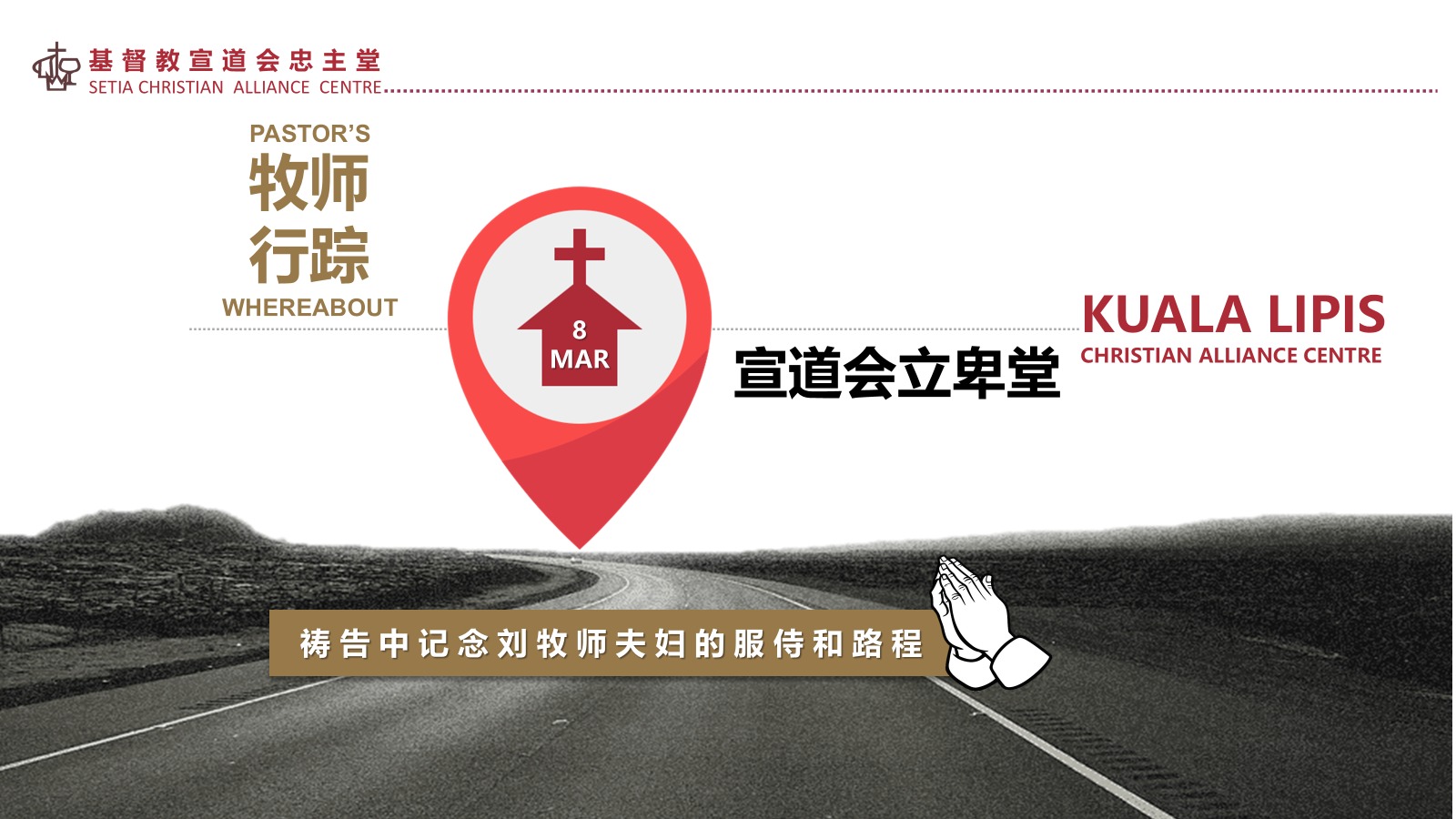 3. 牧者行踪本堂牧者刘泽丰牧师夫妇於昨天前往立卑有服侍,祷告中记念刘牧师夫妇的事奉和路程。