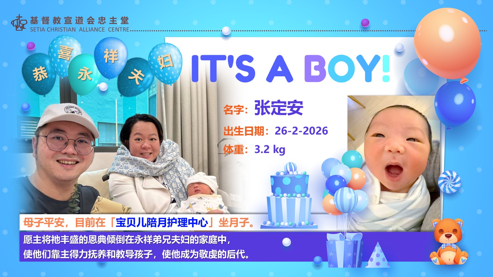 5. 新添宝宝:恭喜张永祥弟兄夫妇,郑薇珊Sharon姐妹於2月26日星期四,顺利生下一男婴,体重3.2kg,儿子取名为张定安,母子都平安,目前在“宝贝儿陪月护理中心”坐月子。愿主将祂丰盛的恩典倾倒在永祥弟兄夫妇的家庭中,使他们靠主得力来抚养和教导孩子,成为敬虔的后代。