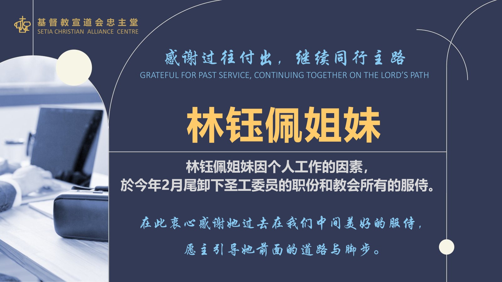6. 教会圣工委员消息:林钰佩姐妹因个人工作的因素,於今年2月尾卸下圣工委员的职份和教会所有的服侍。在此衷心感谢她过去在我们中间美好的服侍,愿主引导她前面的道路与脚步。