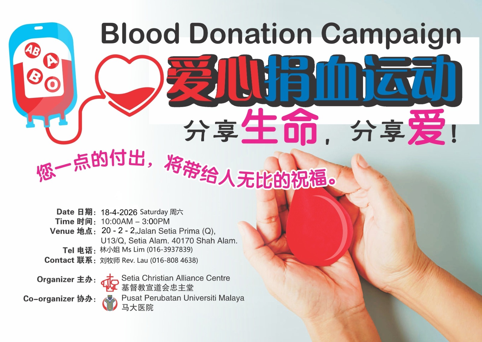 4. 第19届爱心捐血运动:感谢神的看顾与保守,带领昨日的捐血运动顺利地进行,总共有18人前来捐血,其中14人成功完成捐血,而其中有3人是我们教会的弟兄姐妹。在此要诚心感谢所有前来捐血,担任义工,以及帮忙做宣传和邀请家人亲友来捐血的弟兄姐妹们,愿主记念各位在祂里面的服侍和摆上。