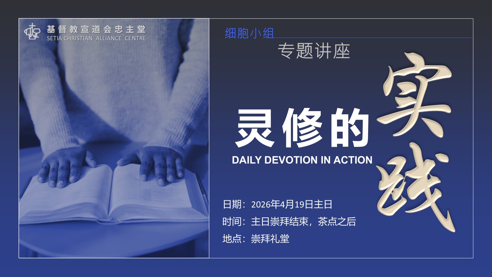 3. 细胞小组聚会:今早崇拜结束后,欢迎弟兄姐妹留步享用茶点和互相交通团契,之后我们将在崇拜礼堂有个专题讲座“灵修的实践”,欢迎大家来聆听和学习。而下主日崇拜结束后,细胞小组将继续有分组聚会。