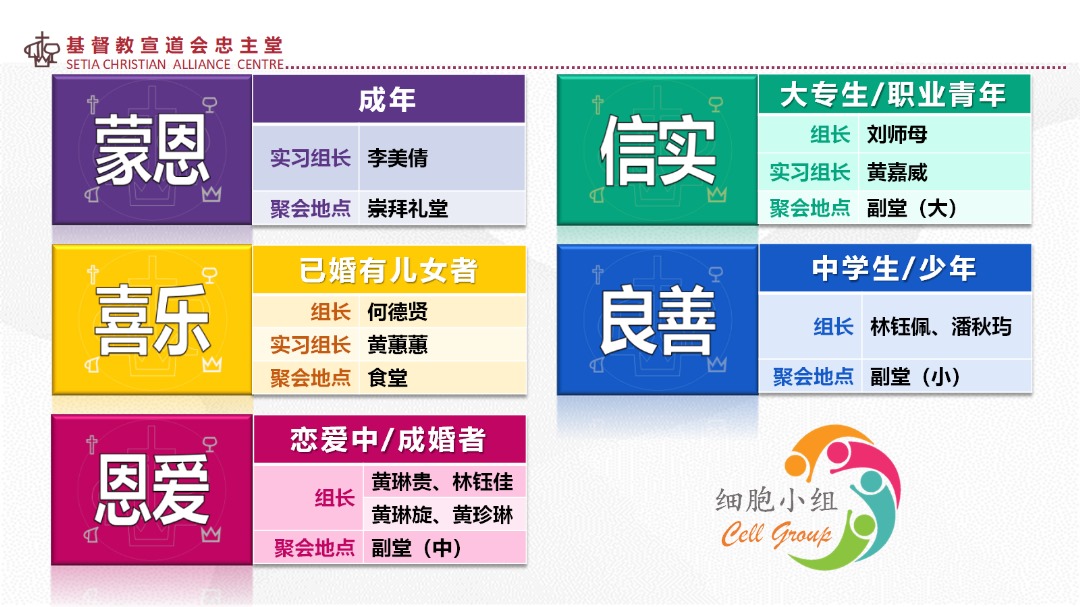 - 细胞小组聚会:今早崇拜结束后,欢迎大家留步享用茶点和互相交通团契,之后即可移步到各自小组聚会的地点来回应今早的信息,并彼此交流,分享和代祷。