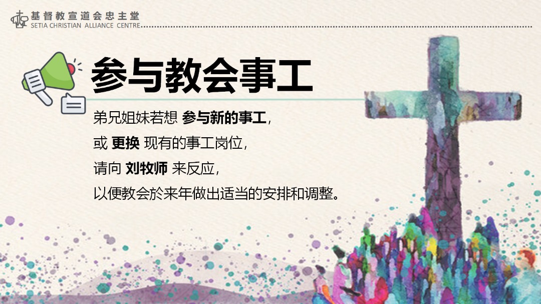 - 参与教会事工:弟兄姐妹於新的一年里,若要参与或调换某项事工或服侍的岗位,可知会刘牧师,好让教会可按照各人的意愿和恩赐来调整和安排服侍的岗位。