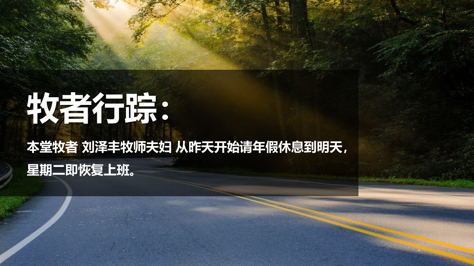 - 牧者行踪:本堂牧者刘泽丰牧师夫妇从昨天开始请年假休息到明天,星期二即恢复上班。