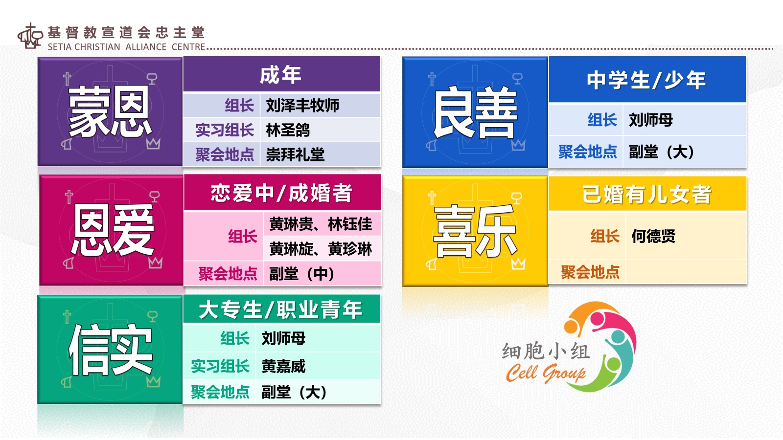 - 细胞小组聚会:今早崇拜结束后,欢迎弟兄姐妹留步享用茶点和互相交通团契,之后即可自由散会。下主日为复活节主日,我们的细胞小组於崇拜结束后将有聚餐。