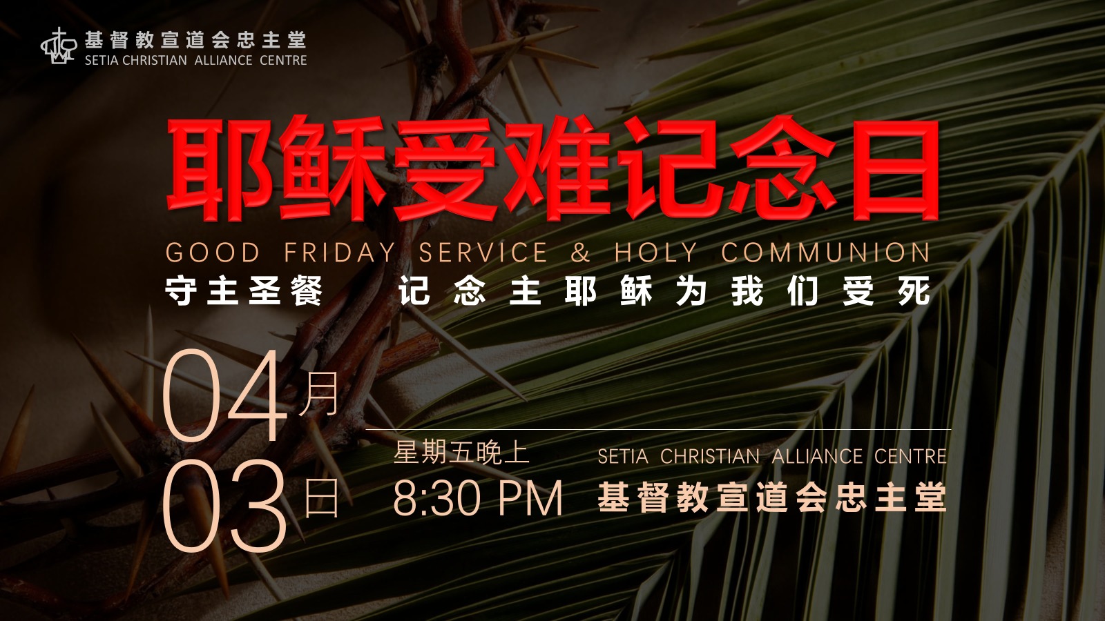- 受难节聚会:4月3日,来临的星期五晚上8:30pm,在本堂将有主耶稣受难的记念聚会,我们将透过神的话语和圣餐来体悟主耶稣基督为我们的罪和过犯,钉死在十字架上,让我们众圣徒预备心同来领受神在基督耶稣里要赐给我们的恩惠。
