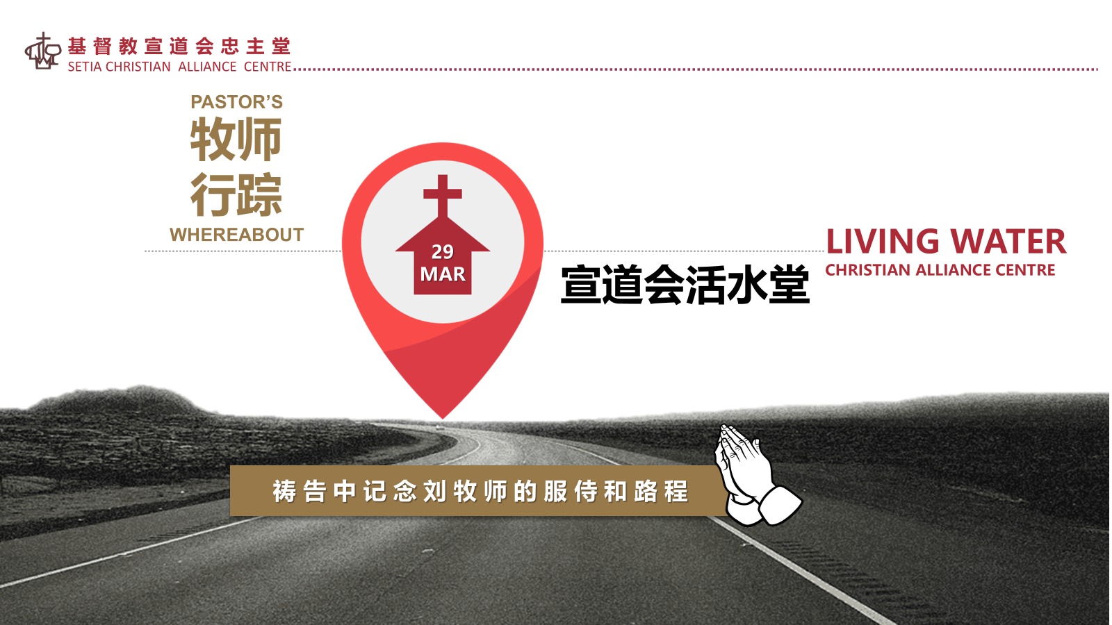 - 牧者行踪:本堂牧者刘泽丰牧师於今早前往活水堂服侍,祷告中记念刘牧师的事奉和路程。