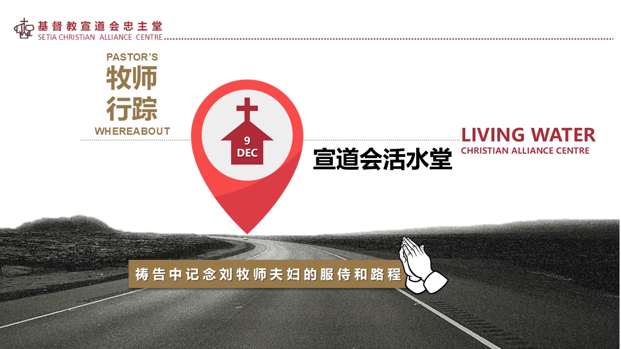 3. 牧者行踪本堂牧者刘泽丰牧师夫妇於今早前往活水堂服侍,祷告中记念刘牧师夫妇的路程和事奉。