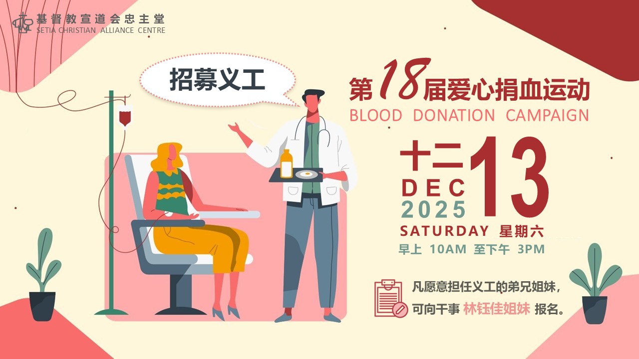 5. 第18届爱心捐血运动:将於12月13日星期六早上10am至下午3pm在本堂举行,欢迎弟兄姐妹邀请家人亲友一起来捐血,当天我们需要义工,可向教会干事林钰佳姐妹报名。