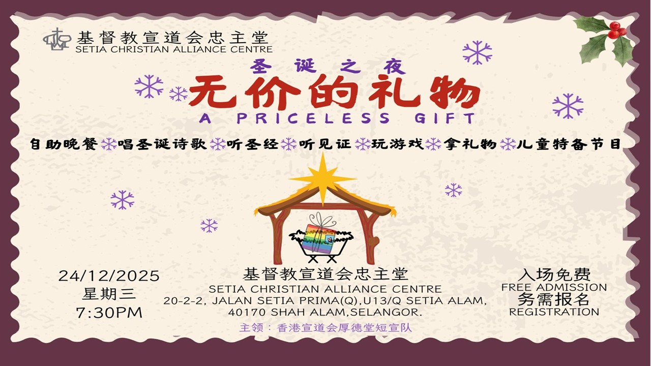 7. 圣诞之夜“无价的礼物”:将於12月24日星期三晚上7:30pm在本堂举行,由香港宣道会厚德堂短宣队负责带领。当晚的节目有自助晚餐、唱圣诞诗歌、听圣经、听见证、玩游戏和拿礼物,儿童则有特备节目。欢迎弟兄姐妹邀请家人亲友同来欢庆救主耶稣的降生,稍后将开放进行线上报名。